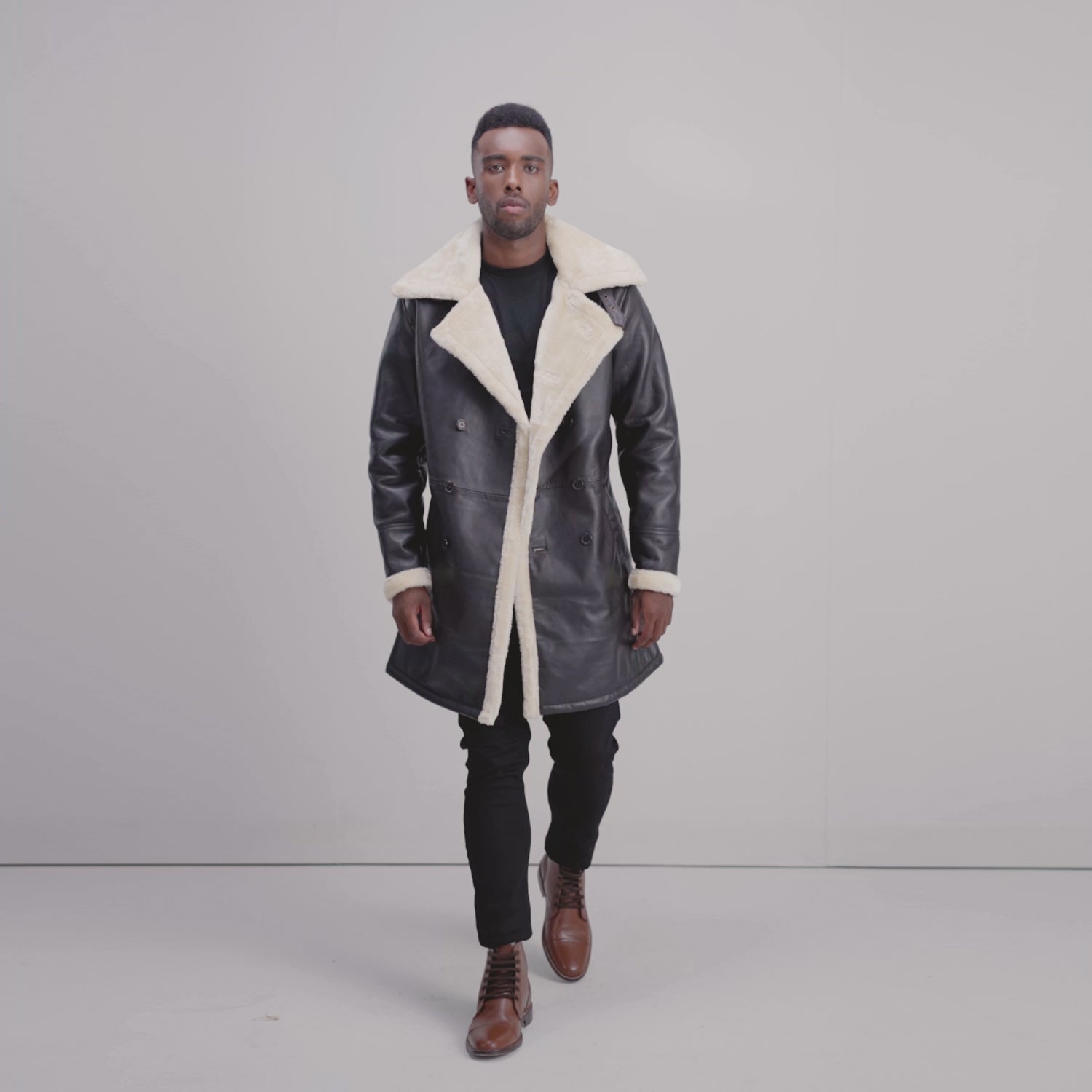 Charles Brown Leather Shearling Double-Breasted Coat
