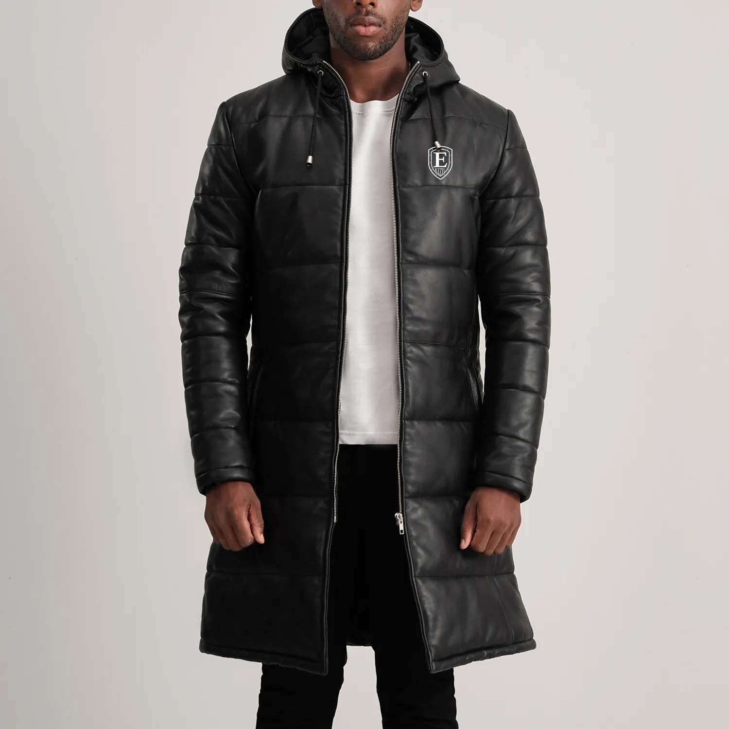 • Base: Floyd Black Hooded Leather Puffer Coat